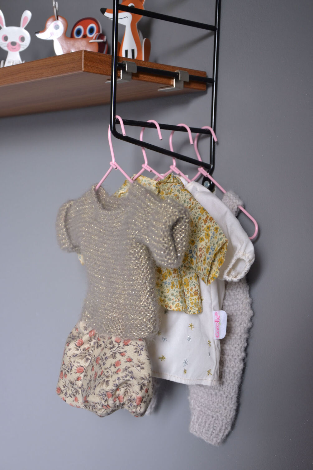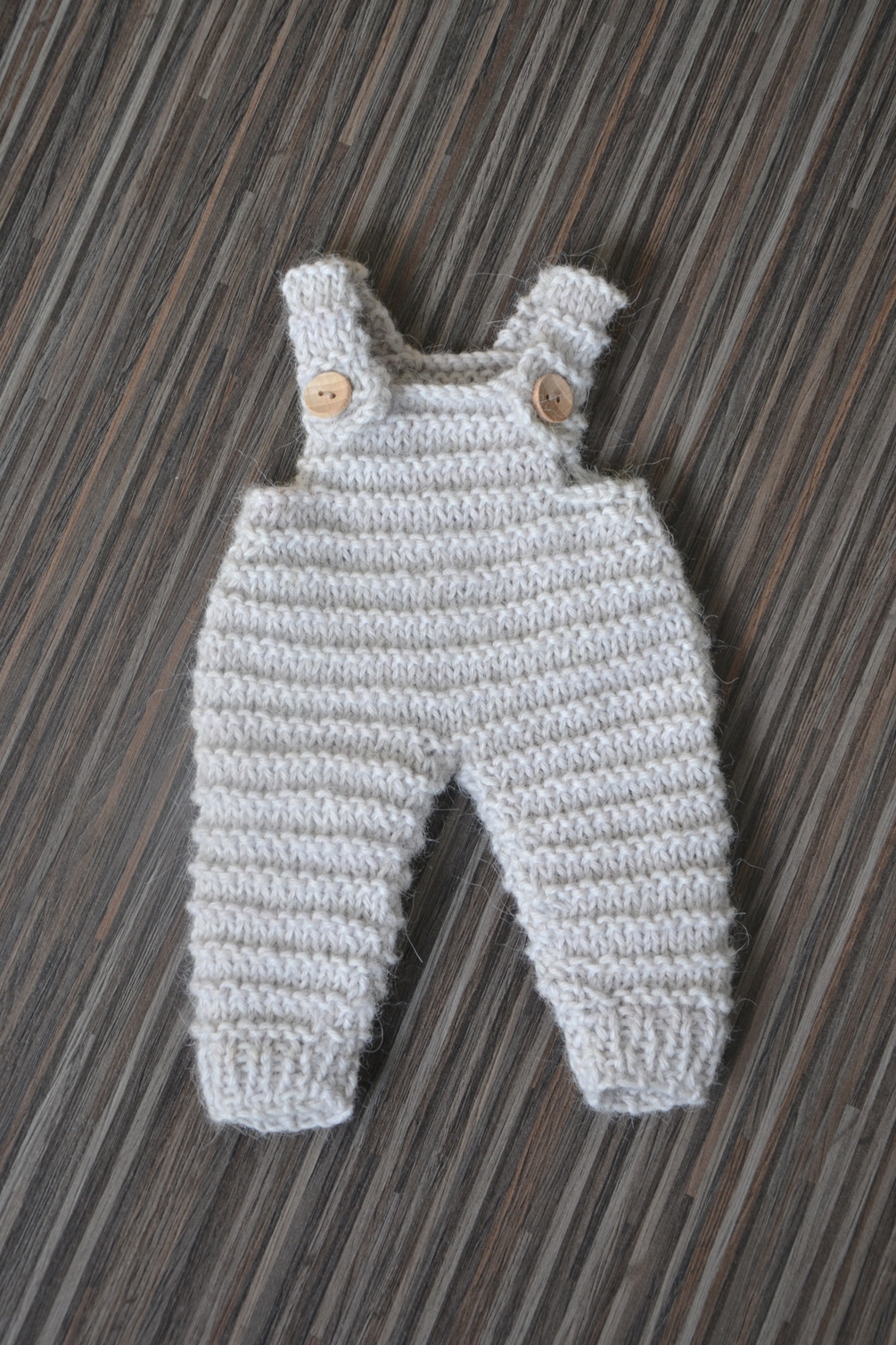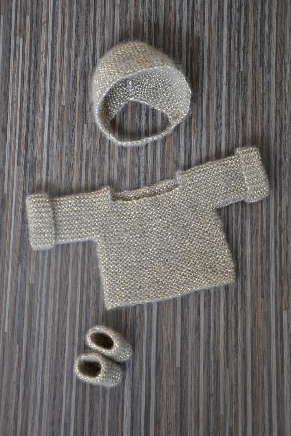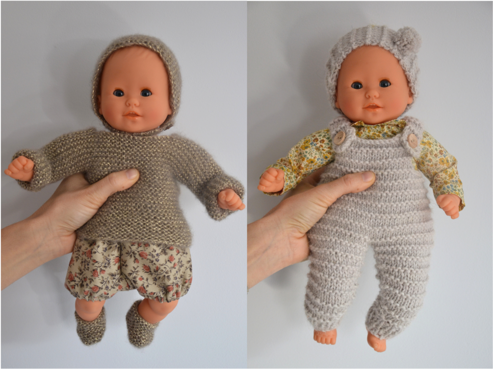 Instructions pour tricoter un pull, un béguin, une salopette, des chaussons et un bandeau pour poupon de 30 cm.